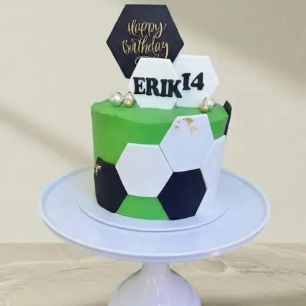 Vår ”Fotbollsstjärnans Måltårta” är skapad för alla som lever och andas fotboll. Med en intensiv grön färg som påminner om gräsplanen och klassiska svartvita hexagonmönster, är denna tårta en säker vinnare på födelsedagskalaset. Den eleganta guldiga ”Happy Birthday”-skylten ger en exklusiv touch till firandet.